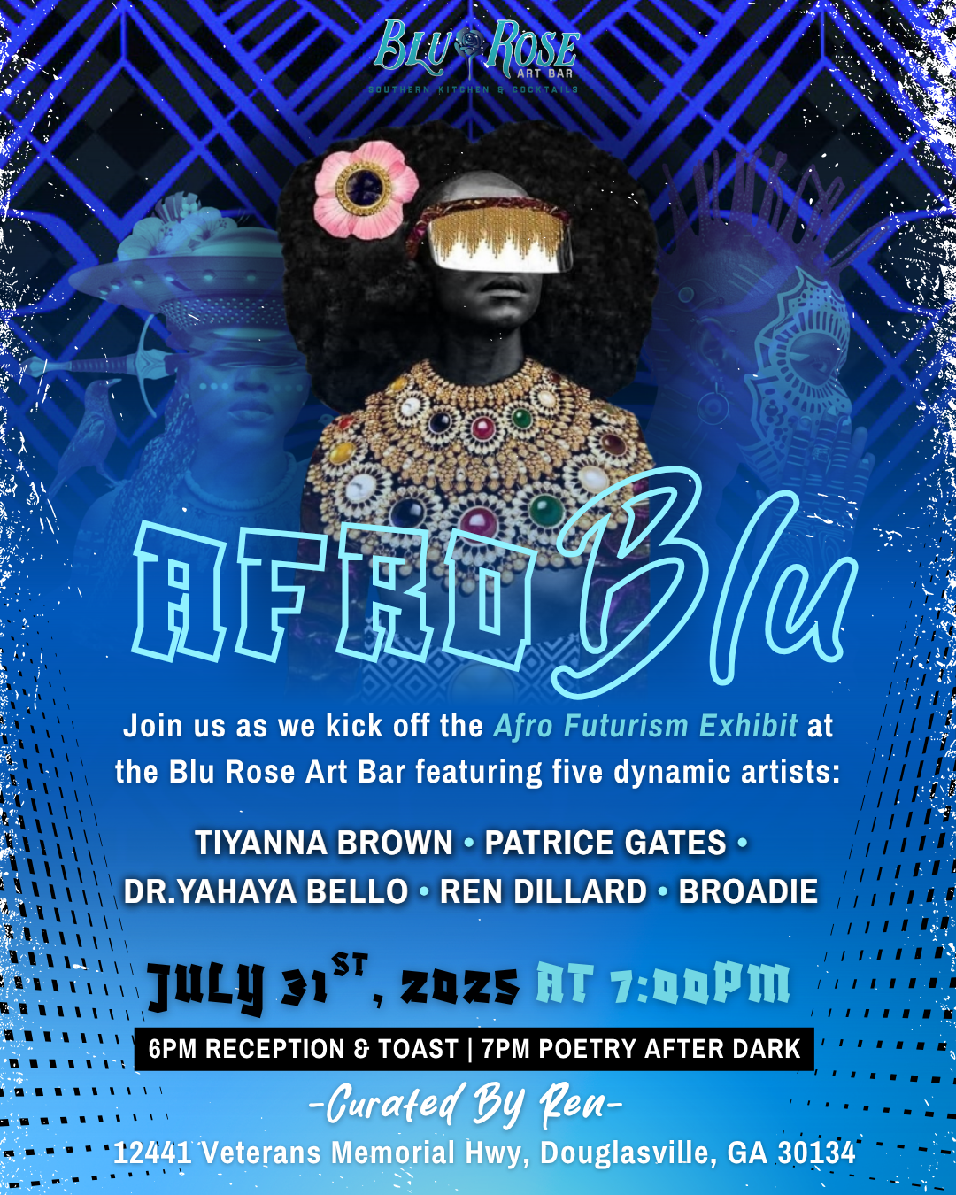 Afto Blu is a bold Afrofuturism group exhibition curated by rEN Dillard, opening July 31, 2025 at Blu Rose Art Bistro in Douglasville, GA. Featuring artists Tiyannak Brown, Dr. Yahaya Bello, Patrice Gates, Broadie, and Dillard, the show explores Black identity, ancestral memory, and speculative futures through painting, mixed media, and digital works. The exhibition title “Afro” and “Blue,” invokes both the vastness of the diaspora and the cosmic, intuitive pulse of Black imagination. Each artist offers a portal into new mythologies and liberated realities, using creativity as a tool for healing, transformation, and cultural prophecy.The partnership between Blu Rose Art Bistro and rEN Dillard marks an innovative leap for Douglasville—a city not often associated with Afrofuturism. By hosting Afto Blu, Blu Rose positions itself as a cultural incubator and community bridge, expanding access to visionary Black art and ideas. The exhibition invites local audiences into an immersive reimagining of the future—where liberation is not a fantasy, but a felt and visualized reality. Afto Blu isn’t just an art show; it’s a signal that the future of Black creativity is already unfolding, right here.
